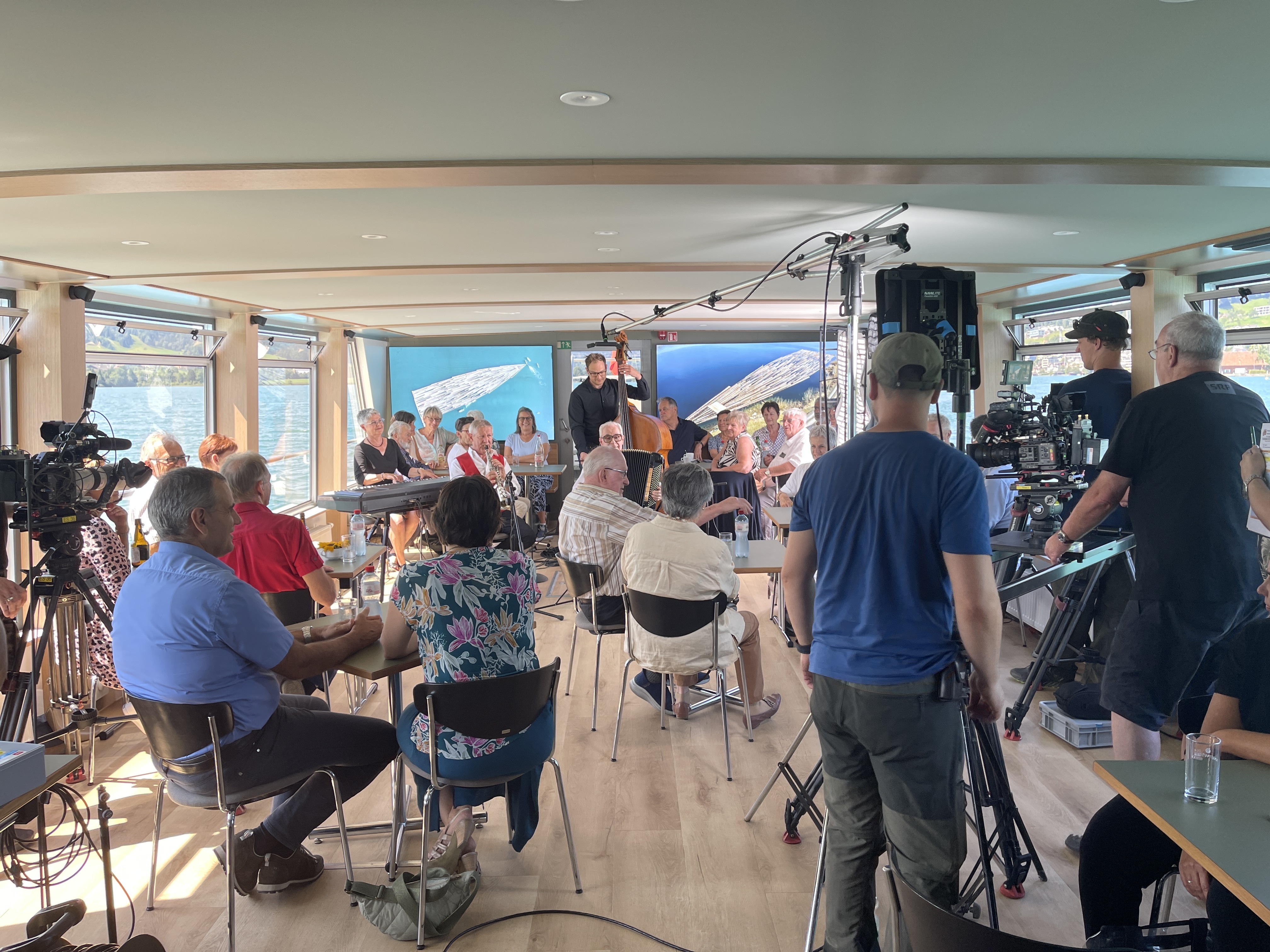 Noch einen Schritt weiter ging die SRF-Sendung Potzmusig: Sie produzierte eine ganze Folge direkt auf dem Schiff. Dank nahezu lautlosem Elektroantrieb wurde das E-MS Ägerisee zur perfekten Bühne für Ländlerklänge und Moderator Nicolas Senn als «Hilfsmatrosen».